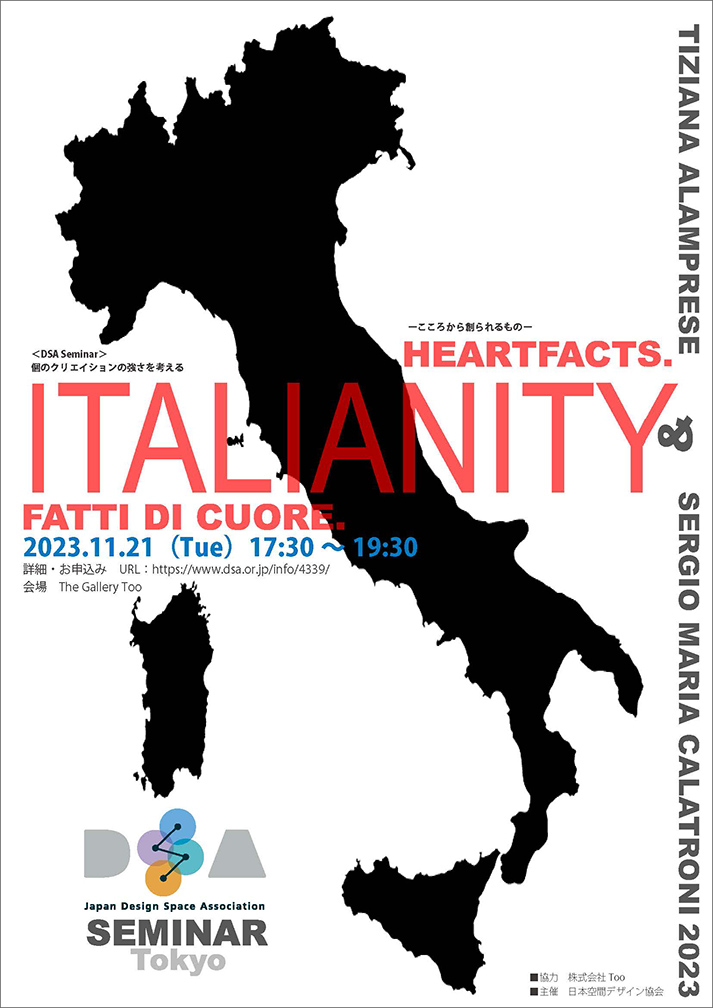 世界最先端のデザインが集まる芸術大国のイタリアから、セルジオ・カラトローニ氏とティツィアナ・アランプレセ氏をお招きして、『個』のクリエイションの強さについて考えるトークセッションです。ぶれない軸のあるお二人から、クリエイション哲学の根底にあるイタリアの歴史と文化、グローバルマーケットで戦うクリエイターが持つべき視点、埋没しない「個」についてお話いただきます。日本人より日本という市場を知り、日本人的感性を熟知するお二人と、ご自身の「個」の強さを高めるためのクリエイション哲学や、それを構築するために自らが育んでいる内面的文化についていっしょに考えてみませんか。