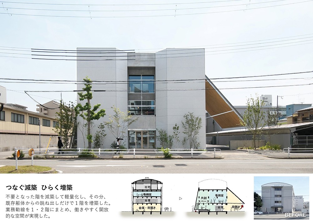 避雷設備を設計・施工する企業の神戸にある営業所の改修計画である。1989年竣工のRC4階建ての既存建物は,倉庫が1・2階にわかれているのが不便で,さらには35年の間に4階の社宅は不要になり,3階の事務室も半分以上が余っていた。そのため1/3程度の規模の2階建てに建て替えたいというのが当初の要望だった。しかし,調査をしてみると内装や設備は更新時期を迎えていたものの,躯体や外装タイルは健全だった。そこで私たちは,大量の廃棄物を出してわざわざ小さく建て替えるのではなく,不要な部分を減築して軽量化し,その分,既存躯体からの跳ね出しだけで基礎を作らず増築する提案をした。これにより倉庫を1階に集約し,事務室と吹抜けでつなぐことで要望をかなえることができた。さらに,今後70年以上ある躯体寿命を全うしてもらうことも重要だと考え,新たに付け足す材料には「経年美化」する素材を選び,ユーザー自身で容易に補修や交換が行えるディテールにするなど,時とともに建築への愛着や価値が増していくよう意図した。